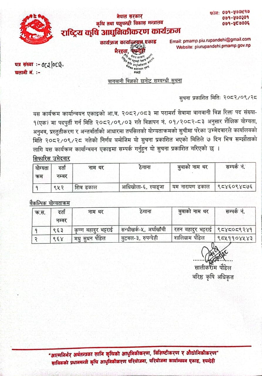 आ.व. २०८२/०8३ को वार्षिक स्वीकृत कार्यक्रम अनुसार कृषि तथा पशुपन्छी उद्यमशिलता विकास कार्यक्रम अन्तर्गत सम्झौताका लागि स्वीकृत भएका लाभग्राहीहरुको छनौट सम्बन्धी सूचना